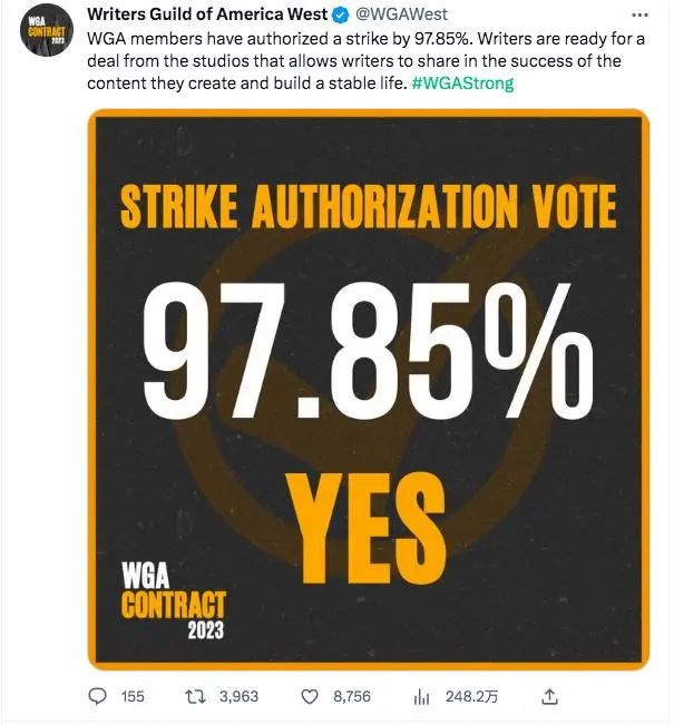 据美联社报道,自 1960 年以来,WGA编剧罢工次数超过了好莱坞的任何团体,共有 6 次罢工。基本上每一次,都是新媒介变化带来的利益分配问题。比如1988年的罢工,争论的是DVD的收益分配问题,2007年则是要求流媒体平台在预算充足的情况下必须雇佣公会成员。