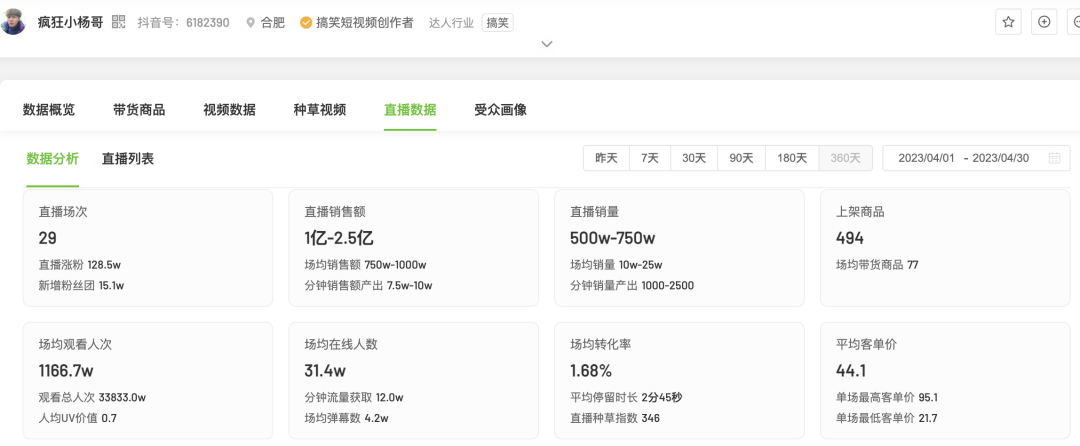 对于疯狂小杨哥来说,尽管粉丝破亿,但是在抖音中心化的流量分配机制下,小杨哥只有不断花钱买量,才能维持行业关注度,其直播带货数据也随之呈现不稳定性。去年10月抖音的主播带货榜中,疯狂小杨哥还以2.5亿元-5亿元的销售额排名第二;但是刚刚过去的4月份,疯狂小杨哥排名降至第七,直播间销售额则降至1亿元-2.5亿元。