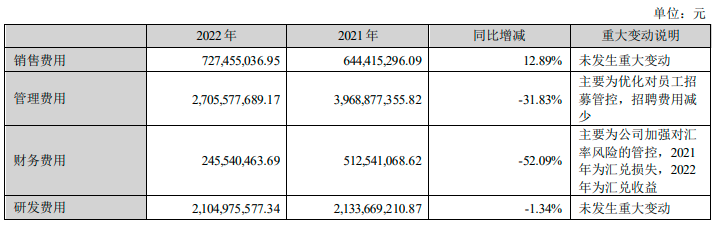 财报数据显示,蓝思科技2022年财务费用、管理费用分别支出2.46亿元和27.06亿元,相较2021年同期缩水2.67亿元、12.63亿元,降幅分别为52.09%和31.83%。