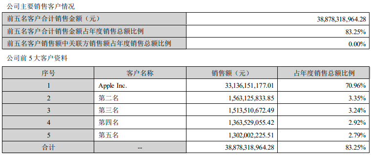 随着与苹果合作的加深,蓝思科技与苹果的“捆绑”也越来越紧,2017年至2020年,苹果订单在蓝思科技营收占比维持在50%左右,到2021年这一比例达到66%,2022年更是超过70%。