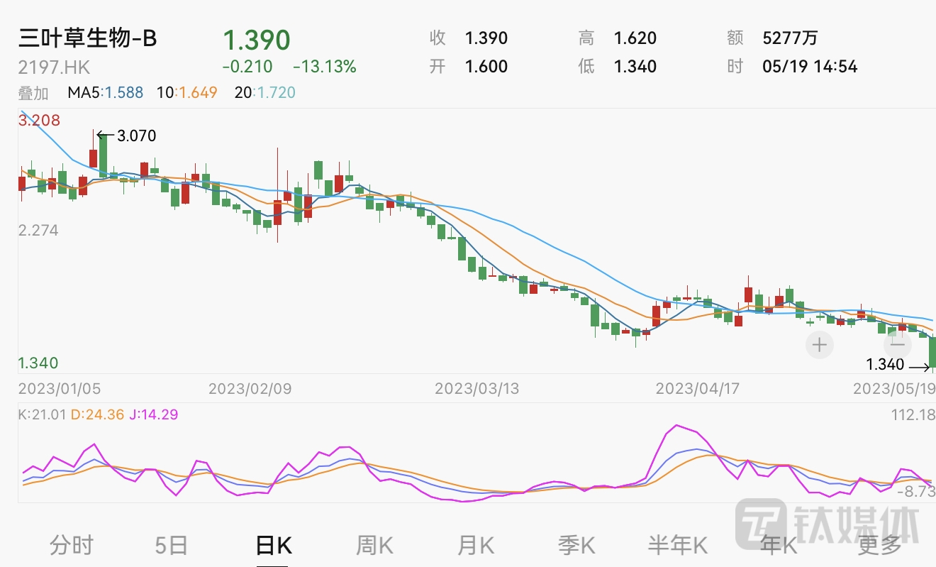 钛媒体APP了解到,三叶草生物-B的股票跌幅也比较大,其原因或与早前机构测算有关,据LiveReport大数据测算,在8月底的定期检讨中,三叶草生物-B可能成为“被剔除的上市公司”其中一员。