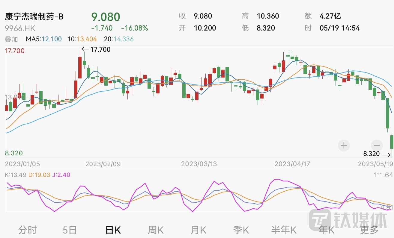 值得注意的是,康宁杰瑞制药-B早前一日(5月18日)的股票跌幅更为严重,当天该股尾盘重挫逾20%,收盘价为10.82港元,跌18.03%,成交额4.15亿港元。