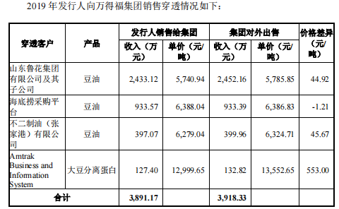 2019年,公司对万得福集团进行关联销售,后者又将采购的产品销售给海底捞、鲁化集团等,万得福集团向前述两家客户销售获得的收入分别为933.39万元、2452.16万元。