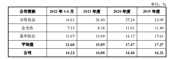 尽管公司产品售价不断上调,但毛利率却接连下滑。2019年-2022年上半年,公司主营业务毛利率分别为16.18%、14.4%、13.83%和13.99%;综合毛利率分别为16.21%、14.4%、14%和14.23%,同期同行业可比公司毛利率平均值分别为17.37%、17.47%、15.89%和12.6%,公司毛利率低于行业均值。