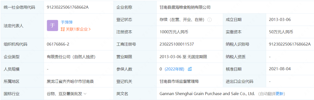 2020年-2021年,公司前五大供应商之一的甘南县盛海粮食购销有限公司,注册资本1000万元,实缴资本仅有50万元。