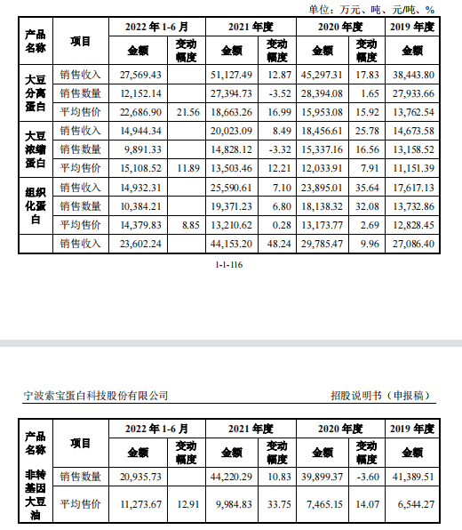 2019年-2021年,公司非转基因大豆采购均价分别为3789.94元/吨、4788.81元/吨、5725.64元/吨和6250.28元/吨,2020年、2021年均价涨幅分别达26.36%、19.56%。2022年上半年,非转基因大豆采购均价继续升高至6250.28元/吨。原材料价格的持续上涨,影响着索宝股份的利润。