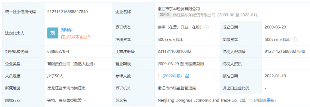 此外,嫩江市东华经贸有限公司在2019年-2021年均为公司第一大供应商,企查查显示,该公司注册资本及实缴资本均为500万元,公司人员规模少于50人;