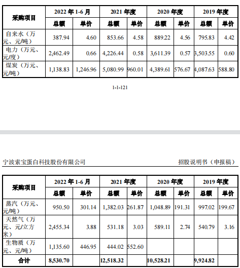 据招股书,公司生产经营需要的主要能源为自来水、电力、煤炭、蒸汽、天然气、生物质等,报告期内,公司能源采购总额分别为9924.82万元、1.05亿元、1.25亿元和8530.7万元。