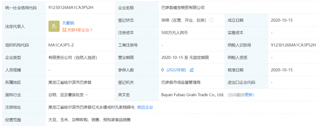 其中,巴彦县福宝粮贸有限公司在2019年-2021年为公司第三大供应商,2022年上半年跃升为第一大供应商。企查查显示,该公司注册资本为500万元,实缴资本不详。