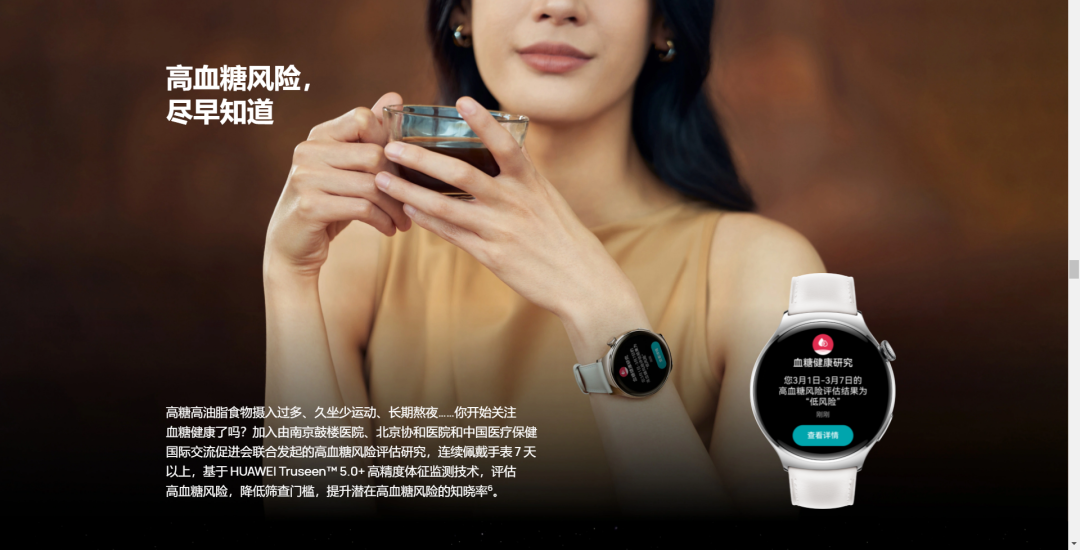 为了避免带给用户——特别是糖尿病患者——超出实际的期待,华为在宣传血糖监测技术中,没有提及“无创”“监测”字眼,而是以“高血糖风险评估研究”模糊带过。