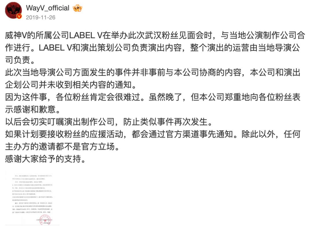 譬如2019年威神V在举办武汉粉丝见面会时,威神V的所属公司LABEL V就将与团票承包给了当地公演制作公司。但该公司却在后续的活动中,被曝出让粉丝承担了所有演出演员的食物和饮料,并威胁粉丝帮忙团队冲热搜。