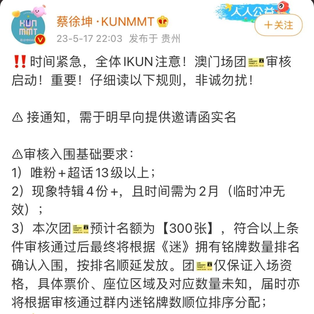 许巍、五月天接连因取消团票登上热搜才过不久,蔡徐坤KUNMMT粉丝团在17日晚“顶风”宣布:开启300张演唱会团票。