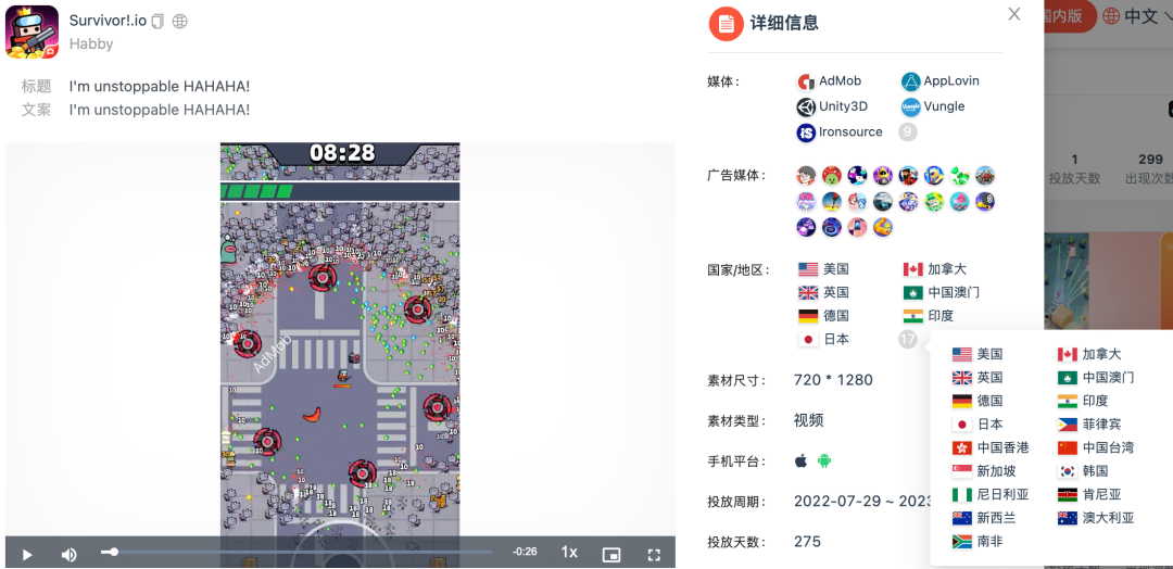 它们投放的素材,多是一个实录素材通投几十个海外市场,也能跑很好。