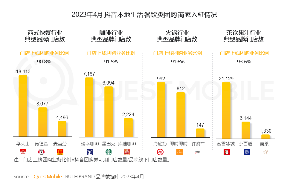 2、以餐饮行业为例,入住商家均为各领域内头部连锁品牌,且门店接入率达90%以上,背后也意味着在市场复苏后,品牌也正积极寻找新的业务增长极