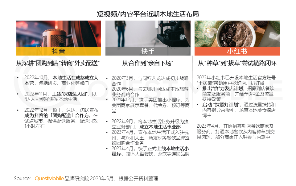 3、此外,各大内容平台也“前赴后继”纷纷入局,开拓本地生活市场,以内容撬动用户兴趣,其中餐饮类到店团购为首要市场切入口