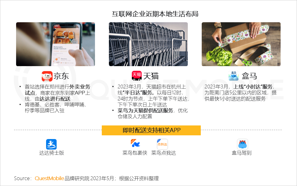 1、近年来,本地生活赛道“战争”从未停止,其中外卖版块竞争日益升级,京东试点同城外卖业务,天猫、盒马几乎在同一时间对外宣布“即时配送”服务,背后靠强大的物流配送作为“护城河”