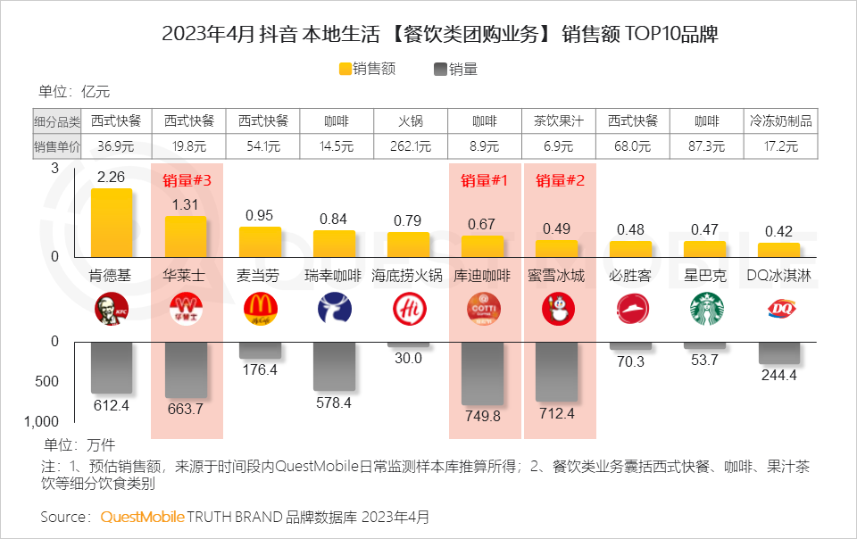 6、从【餐饮类团购】表现来看,销量TOP3品牌均以低价策略吸引用户消费,其中“新晋品牌”库迪咖啡更是以8.9元的价格抢占市场,对比同品类的瑞幸咖啡,优惠超三分之一