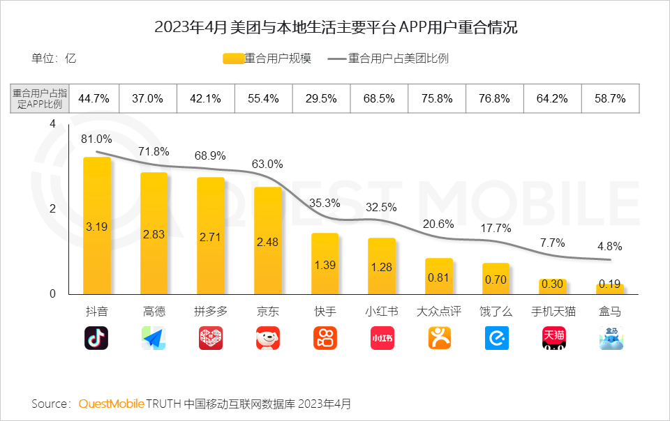 QuestMobile数据显示,美团与抖音重合用户规模超3亿,重合用户占美团用户比例达81.0%,抖音切入本地生活成美团新对手;而饿了么作为美团外卖业务老对手,重合用户占美团不及2成,占饿了么超7成,美团用户体量优势明显。