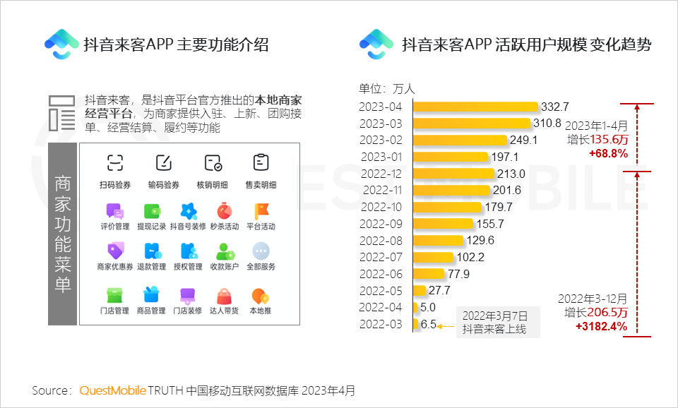 QuestMobile 数据显示,2022年3月至12月,抖音来客APP用户规模增长206.5万,增长率达3182.4%,今年前4个月增长135.6万。