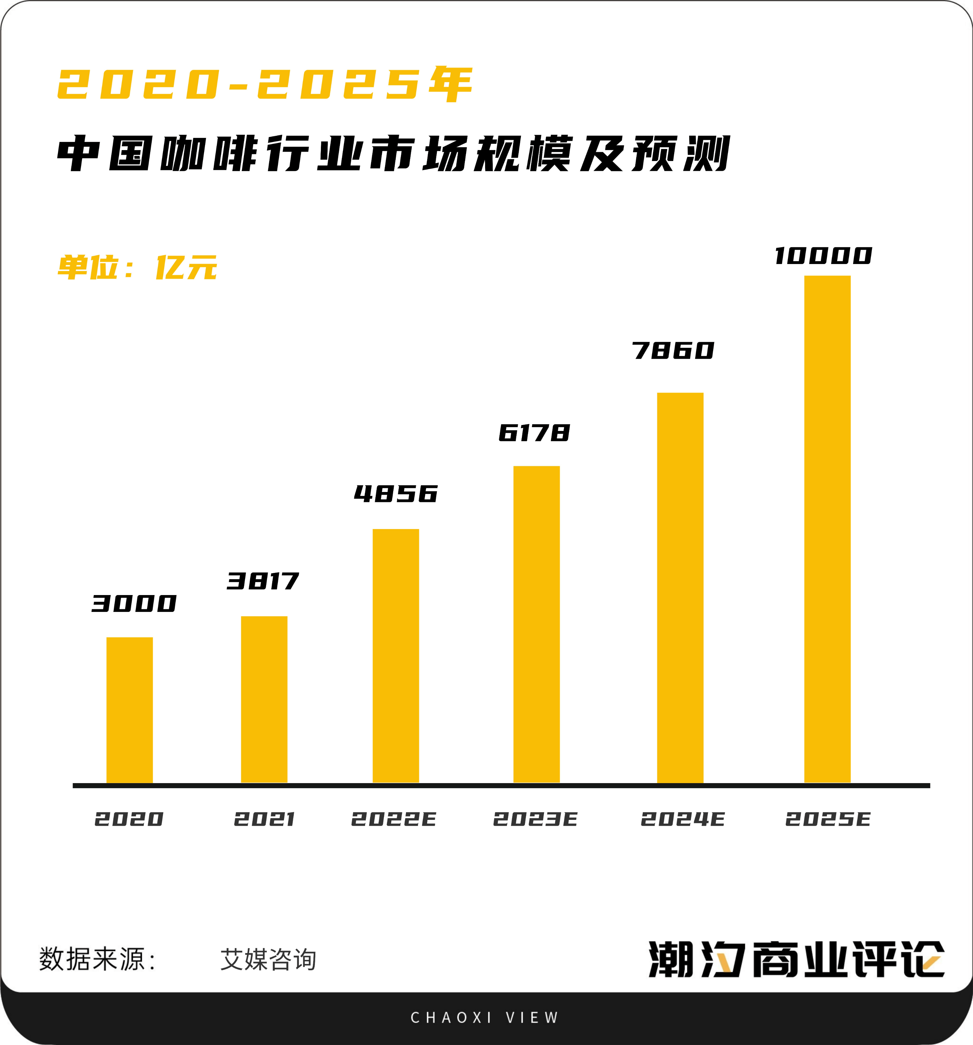 例如以Seesaw、Manner、M Stand和库迪等为代表的咖啡品牌,以CoCo、喜茶、奈雪、蜜雪冰城等为代表的现制茶饮品牌,还有李宁、中国邮政、同仁堂等为代表的跨界选手。据艾媒数据显示,近5年中国咖啡以 15%-20%的速度增长,远高于全球2%的均速,成为世界第一大咖啡消费市场。2021年中国咖啡的市场规模达到3815亿元,预测2025年中国咖啡的市场规模将超过1万亿元。