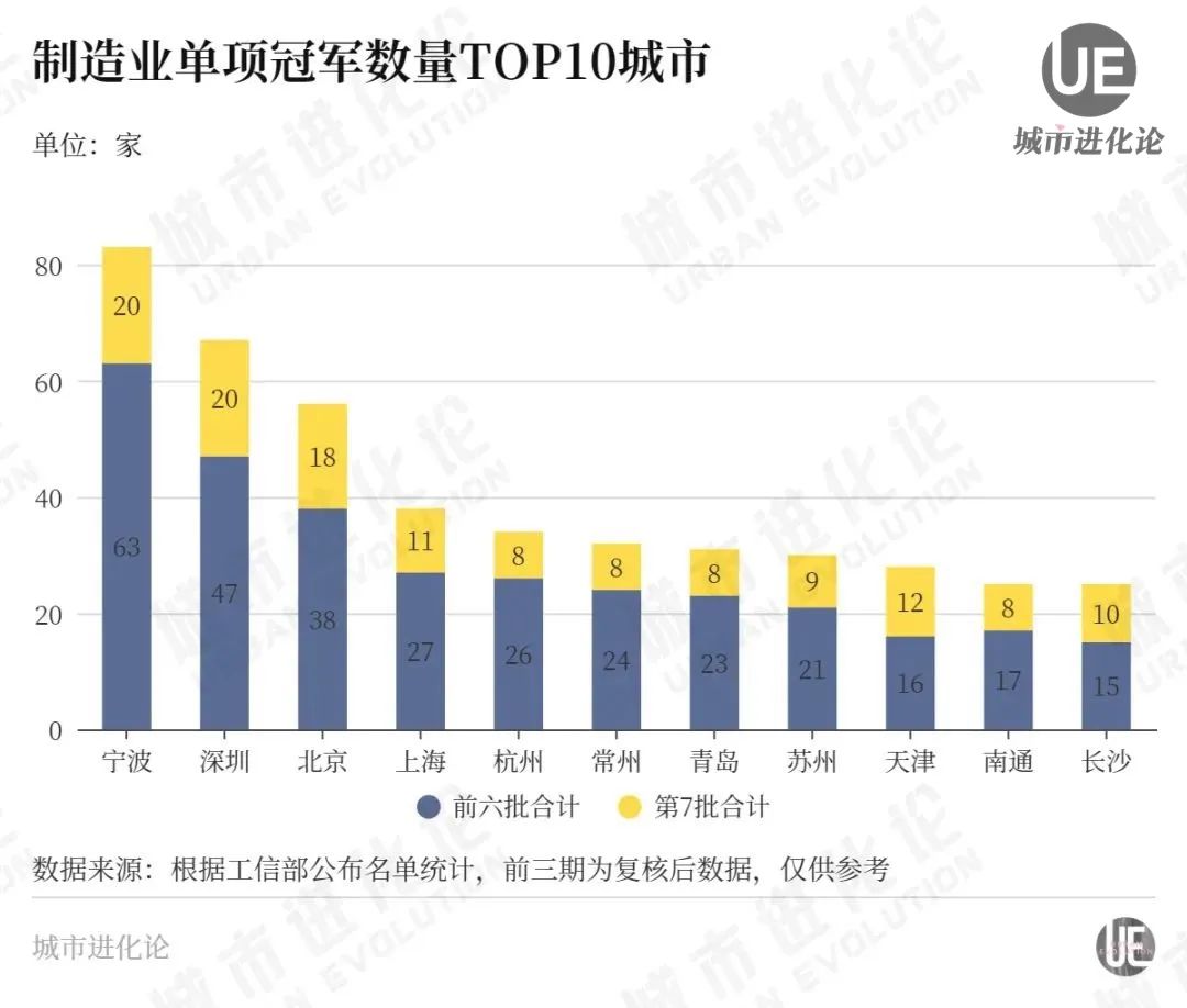 比如,从工信部发布的前七批制造业单项冠军企业(产品)的省份分布来看,上海拥有的企业(产品)数量仅位于全国第9,湖南、河南等中部省份已然居上。再看城市分布,上海以38家居于第4,远低于排名第一的宁波(83家),拥有25家、位居第10的长沙亦距其不远。