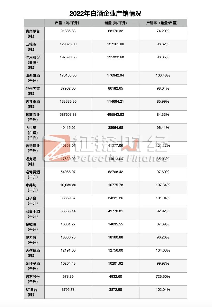 征探君统计了20家白酒企业2022年的产销情况,其中贵州茅台、古井贡酒、顺鑫农业、酒鬼酒、金徽酒5家企业的产销率都低于90%。