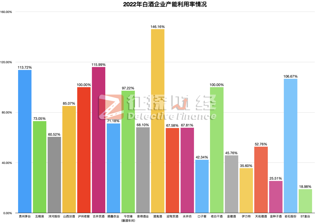 可以看出,去年白酒企业中产能利用率最高的是酒鬼酒,达到146.16%。其次为古井贡酒和贵州茅台,分别为115.99%和113.72%。