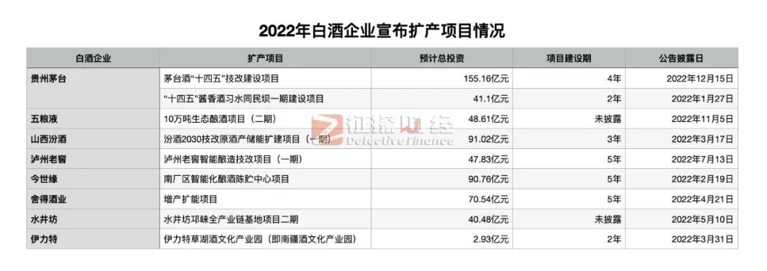 征探君统计发现,2022年,共有8家白酒企业宣布了扩产项目。进入2023年,贵州省的重大工程和重点项目又包含了31个酱香白酒的新建项目。