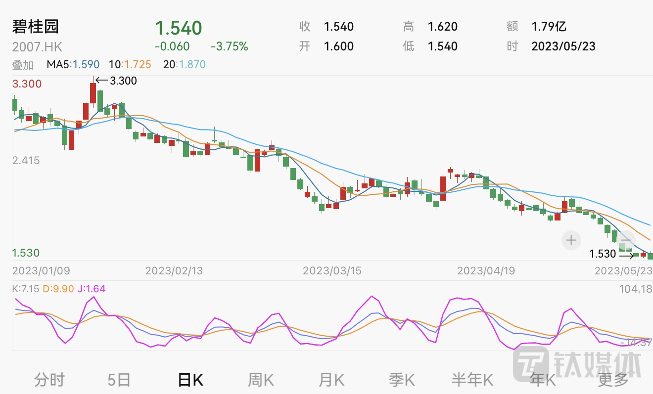 二级市场方面,截至5月23日港股收盘,碧桂园股价报收1.54港元,跌3.75%,成交额1.79亿港元,当前公司总市值为425.62亿港元。