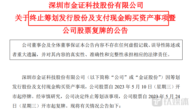 在停牌10个交易日后,5月23日晚间,金证股份发布公告称,公司决定终止筹划发行股份及支付现金购买文华财经90.97%股权事项,公司股票自5月24日开市起复牌。如今,伴随着此次收购终止,也意味着文华财经曲线上市告败。![]()