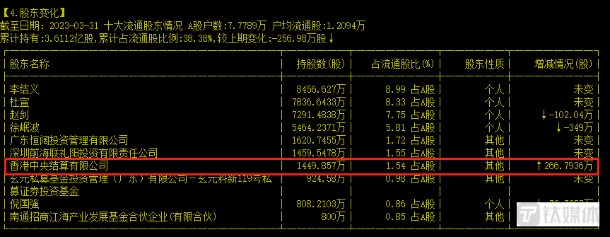 最典型的是北上资金。今年3月底,香港中央结算有限公司以1449.8万股持仓占金证股份流通股比的1.54%,不过到5月停牌前,持股数量已经降到1094万股以下。