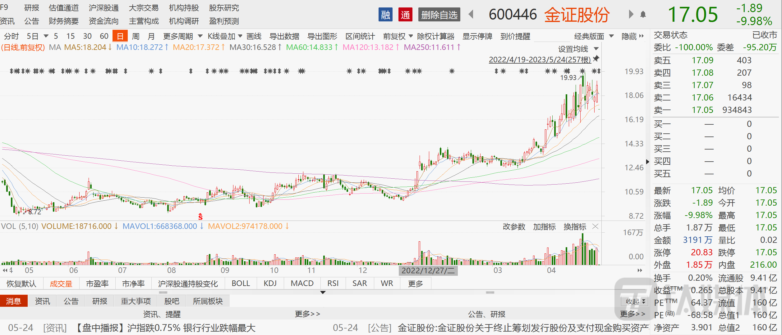 5月24日上午,刚刚复牌的金证股份开盘“一”字跌停,报17.05元,总市值160亿元。![]()