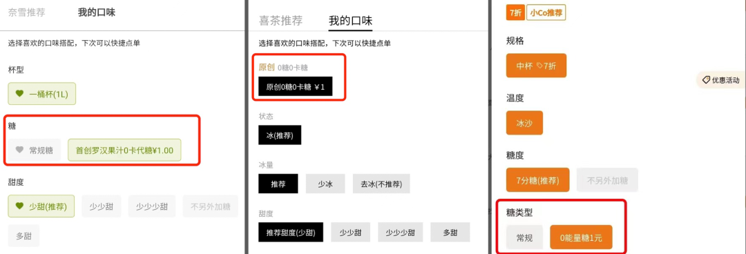 沪上阿姨在菜单中独立开辟控卡专区,主推零卡糖的鲜果茶产品;喜茶、CoCo等品牌,菜单中的全线产品都可更换为0能量糖。