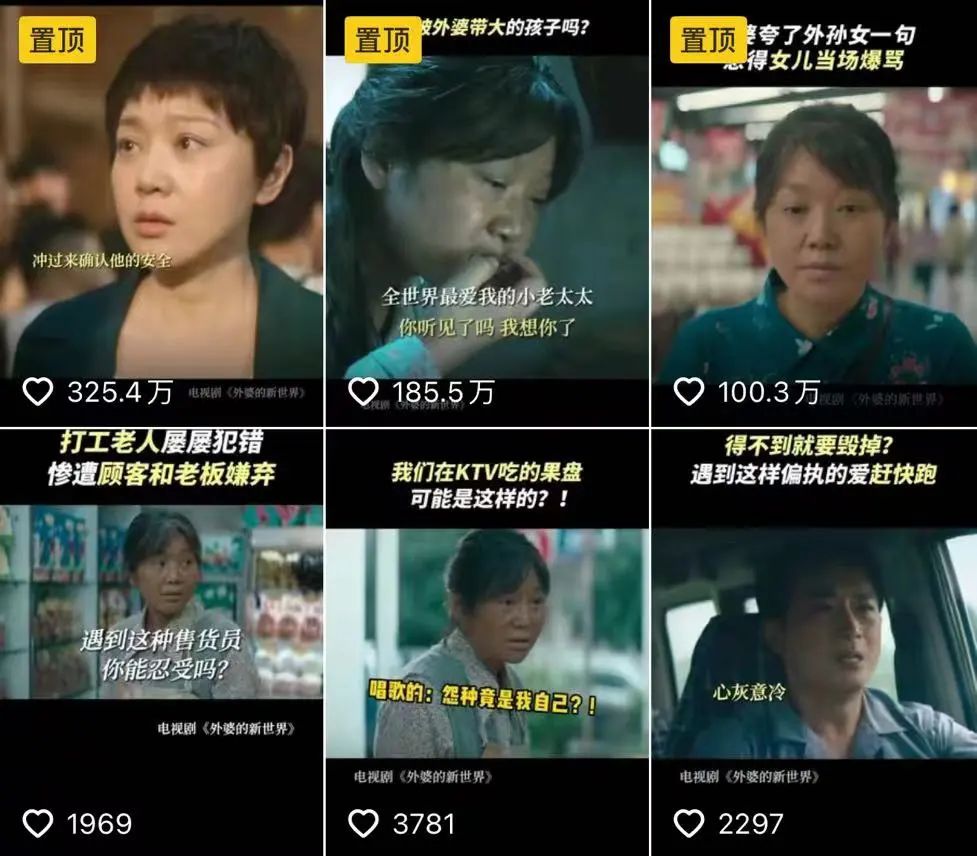 有意思的是,虽然《外婆的新世界》主创强调这部剧的先锋性,剧情结构也向年轻人关心的话题靠拢,但在《外婆的新世界》官方抖音,两支破百万视频,其内容还是呈现现实里老年人的生活。一支视频是“姨婆那个年代的淳朴爱情”,呈现的是姨婆的含蓄爱情;另一支则是“被外婆带大的孩子能懂”,内容是剧里外婆对孩子的疼爱。
