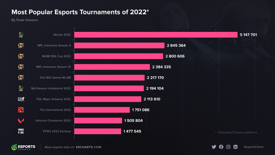 最后,当然离不开沐瞳在东南亚举办赛事上的丰富经验,权威数据平台Esports Charts公布2022年全球最受欢迎电竞赛事排名,在2022年度全球最受欢迎电竞赛事(最高峰值在线人数)排行和电竞赛事总观看时长排行中,MLBB多项赛事入选榜单,并位列移动电竞赛事首位。