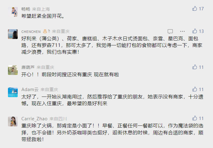 △众多消费者对“惜食魔法袋”入驻重庆表示期待;图片来源:截图自“惜食魔法袋”官微推文