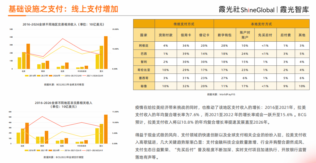 得益于现金式微的风向、支付领域的快速创新以及全球支付相关企业的纷纷入驻,拉美支付收入高歌猛进,几大关键趋势渐渐凸显:支付金融科技企业数量激增、行业并购整合蔚然成风、支付生态日益繁荣、“先买后付”普及程度不断加深、实时支付项目加速执行、开放银行监管落地有声等。