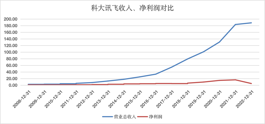 然而,对于科大讯飞而言,在大模型发展的当口,首先要面对增长停滞以及盈利下滑难题。根据2022年财报,科大讯飞营收微增,只有2.77%,归母净利润5.61亿元,同比下滑63.94%。