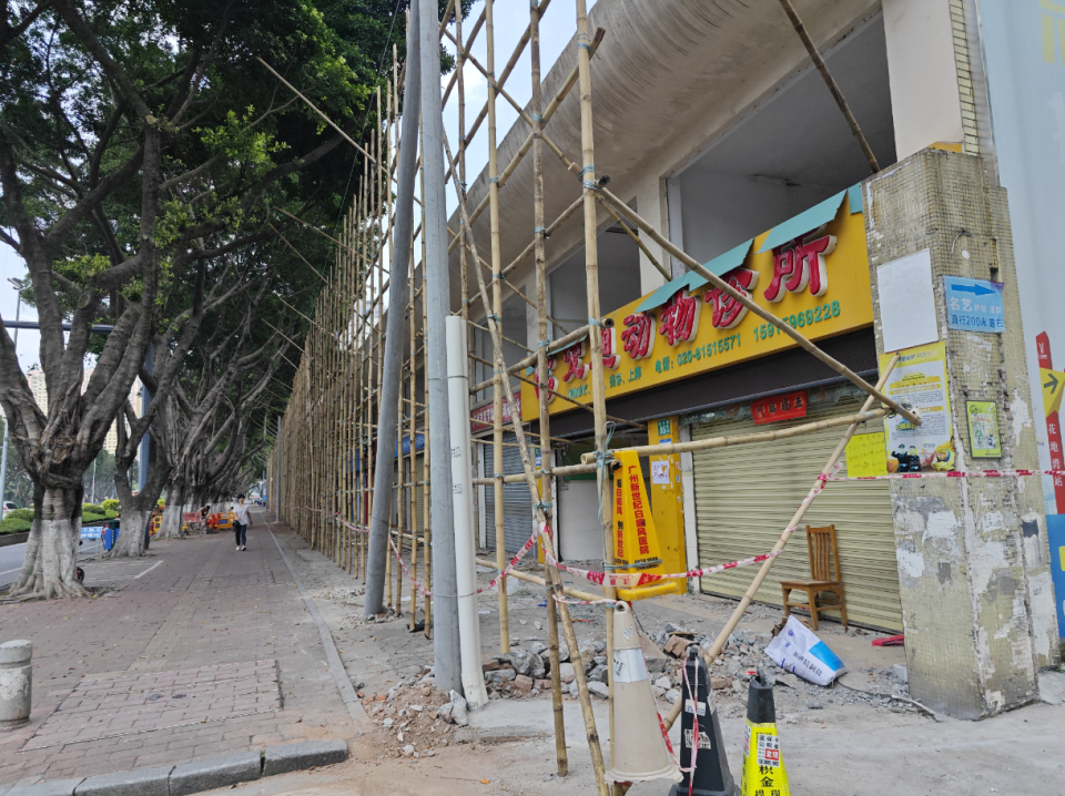 其中,紫兰苑地块已有大片土地被工业围挡包围,往远处眺望能看到正在建设中的金域曦府;在地块另一侧的临街商铺,同样被搭建的大片竹木脚手架围住,地面有施工痕迹,而商铺内部则已腾空。