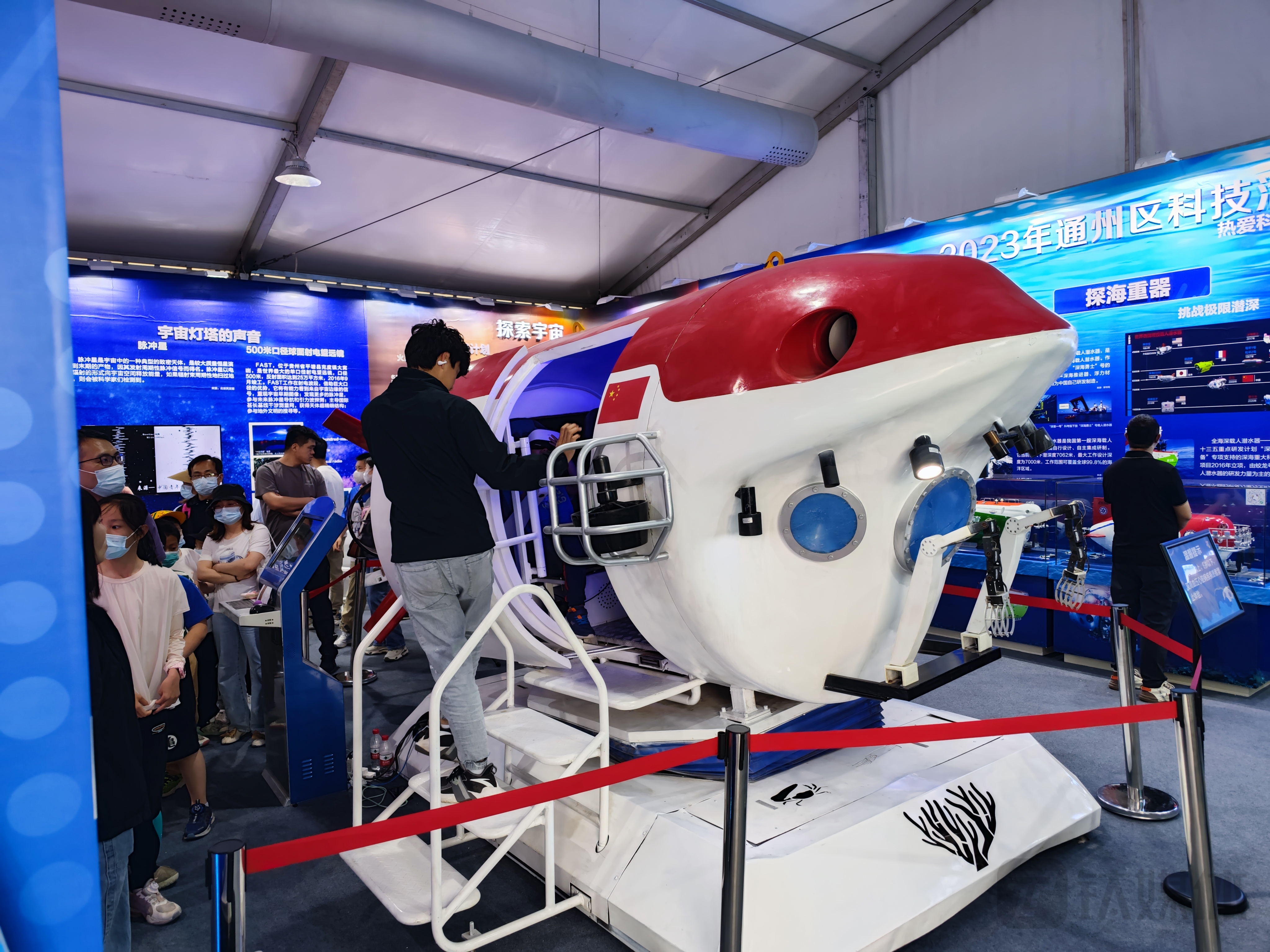 在互动项目展区,吸引观众的目光的是“神舟返回舱”,模拟驾驶装置真实还原驾驶舱,观众可以随时体验。同时,钛媒体App在现场还看到了深海载人潜水器,很多观众排队等待体验。此外,观众还可以“滑雪”“滑雪橇”,在夏天体验“雪上飞”的乐趣。