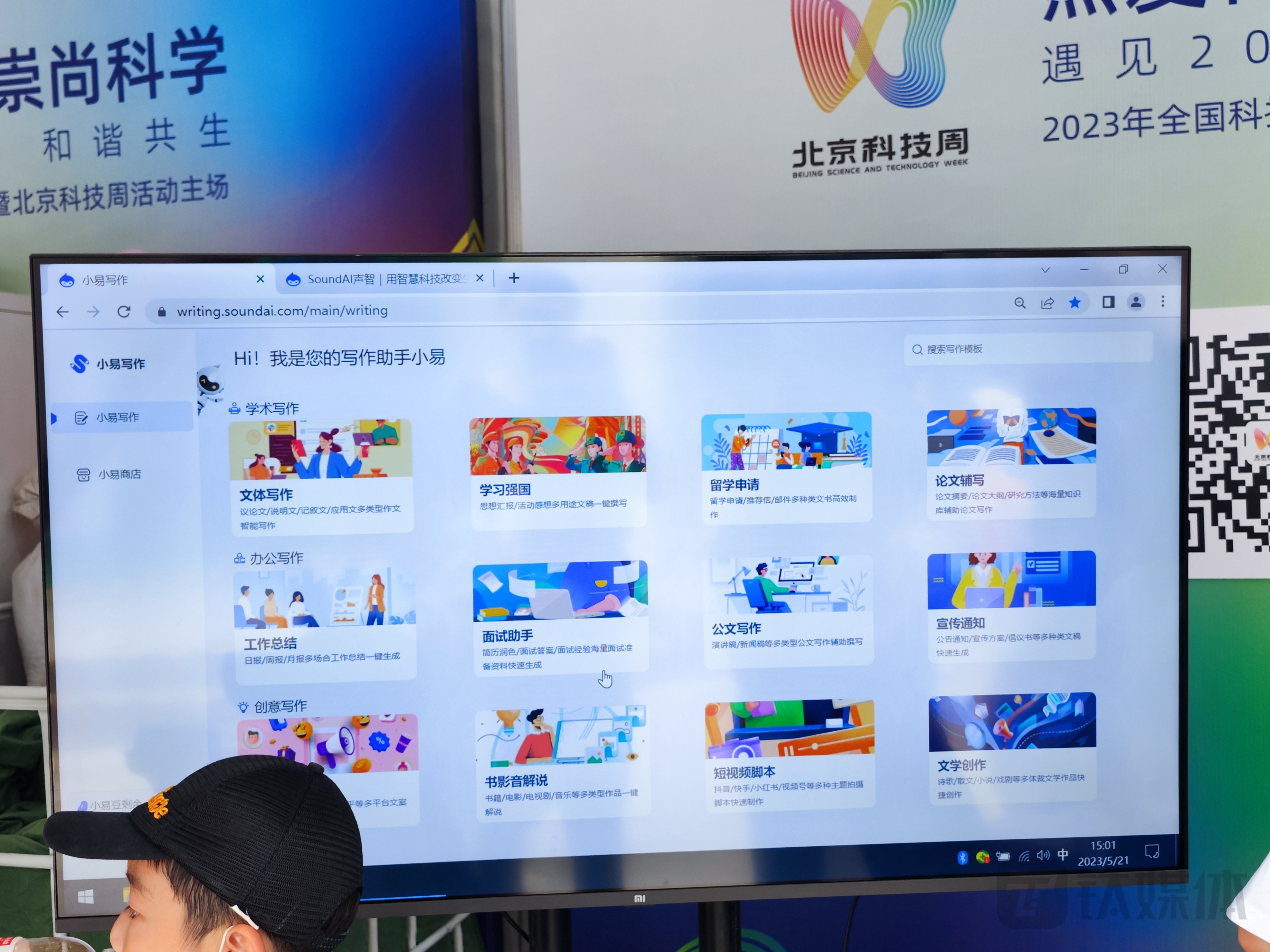 相对于室内 AI 大模型展示,在室外场景中,AI 大模型有了应用与互动。钛媒体App在一个展台现场测试了这款基于生成式 AI 技术的小易写作平台,不用打字就能出现一篇能流利阅读的文章,甚至可以书写白居易的诗句。