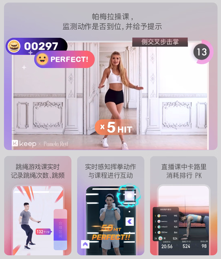 在这一领域中比较出色和破圈的应该要数Keep,Keep通过自家App丰富的健身内容,以此来让手环与App之间做出更深层次的绑定,戴上手环参与Keep官方课程时,可以记录每一次训练的动态心率,甚至还能通过手环的陀螺仪传感器来检测动作是否到位,属于在自己的领域用内容和体验筑起了一条“护城河”。