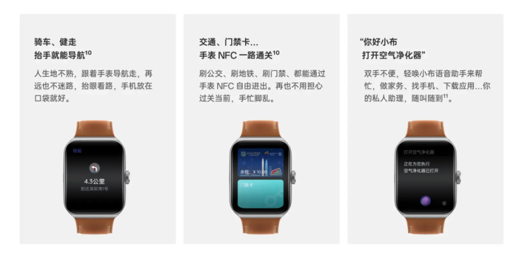 不过智能手表只有健康是不够的,智能同样也是这类产品的主旋律。目前智能手表类产品均推出了协同类功能,比如在手表上可以观看手机的打车信息、导航信息、控制智能家居等等,在相同品牌的手机上甚至可以和Apple Watch掰掰手腕。