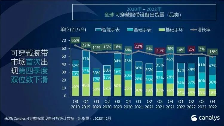 整个2022年整体来看,基础手环已经下跌了39%,与之相反的是,智能手表增长了3%,基础手表增长了21%。