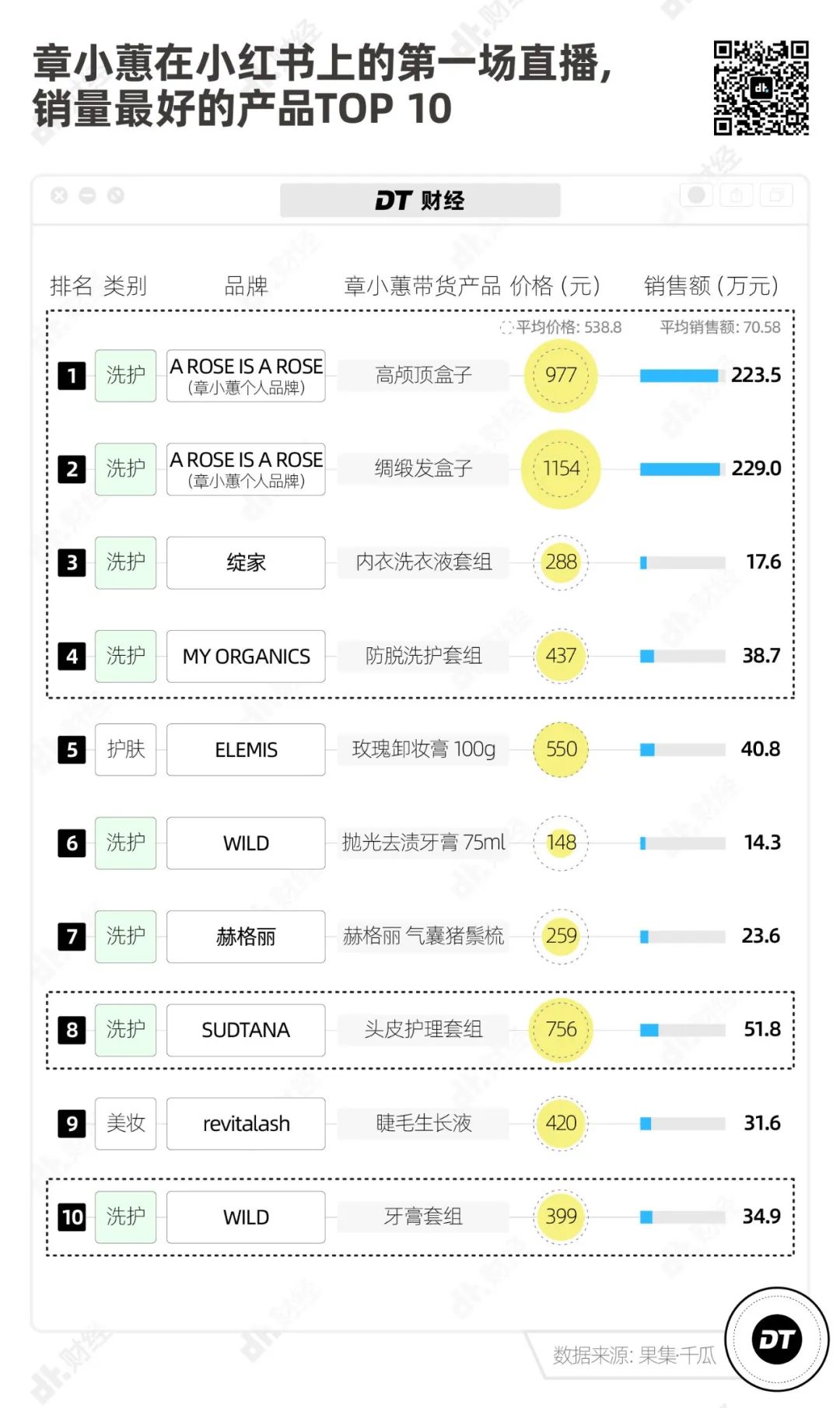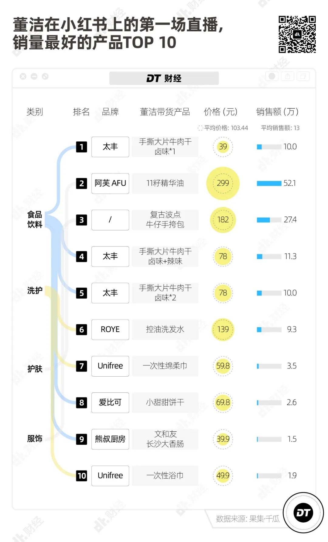 另外,从品类上来看,章小蕙卖得最好的产品基本围绕个人形象的护理,均价超过500元。董洁卖得最好的产品TOP 10则更加生活化、接地气,有一半是零食,均价100元出头。