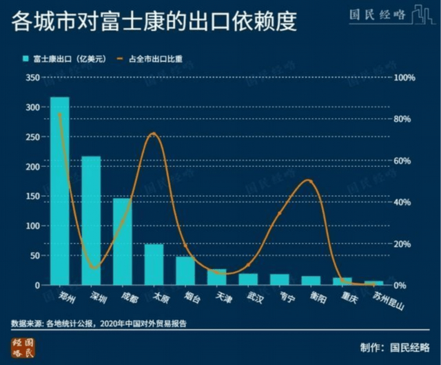 另一方面,富士康之所以选择在郑州建厂,其中一个原因也是因为看中了郑州作为中部交通枢纽的区位优势,郑州也因为富士康所拉动的出口贸易,开始成为国际化物流中心,数据显示,郑州占富士康出口额的比例为82%,远高于第二名太原60%左右的占比。
