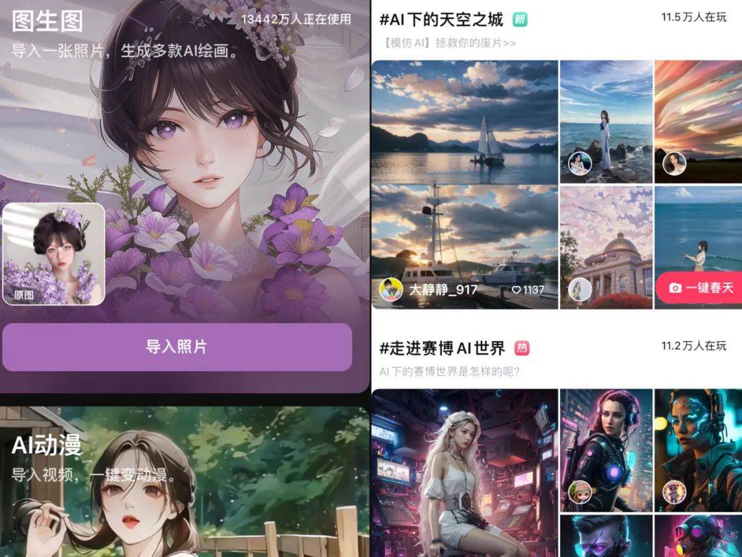 今年5月23日,美图秀秀正式上线“美图AI”频道,内含“AI绘画”“AI设计”“AI视频”等多项功能,为用户提供一站式AIGC创作方式和内容生产工具。美图秀秀首页原本用户晒美颜照片的社区,早已被一众AI创作功能占领。一些功能开启了收费模式,生成100张AI专属头像收费9.9元,会员可以免费使用一次。