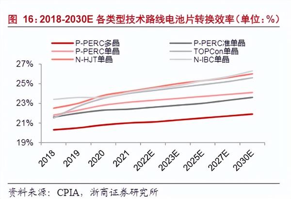 其次,光伏技术已进入瓶颈期,要重大突破的概率也较低。当前电池环节最有希望实现降本的HTJ技术并不具备优势,因为HJT的瓶颈就是耗银量。HJT的每片耗银量是perc的两倍,如果按照2030年全球装机1000GW的保守估计,使用perc技术的2030总银耗量是2021年的6倍,而使用HJT技术的耗银量2030年是2021年的10倍以上。其他的创新方向更是进展很少,比如钙钛矿技术路径如今降本增效仍任重而道远。
