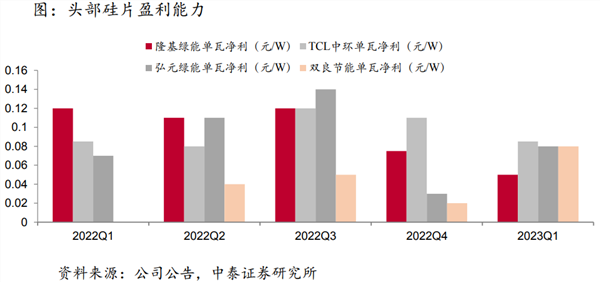 2022年前三个季度隆基硅片的单瓦净利还存在优势,从第四季度开始,TCL中环的盈利能力就超过了隆基。近年硅片环节产能扩张规模较大,后续随着多晶硅供应量释放,硅片环节竞争预计将加剧。