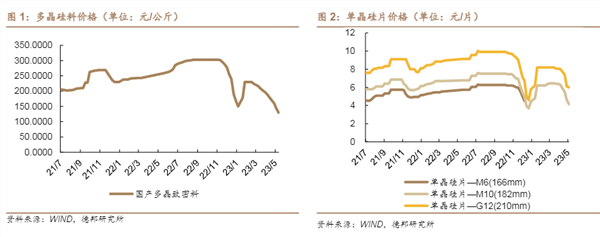 去年供需错配,上游硅料出现大幅涨价,头部硅料企业处于大幅扩产周期,2023年多晶硅产能较2022年增长近一倍,需求不足的趋势在今年已被打破,硅料价格持续下跌,从上游开始传导的价格战已开始。五月以来,TCL中环已两次下调硅片报价,目前其150μm厚度的P型182尺寸的硅片价格已下调至5元/片。5月29日,隆基也开始下调两款硅片价格,降幅达30%,光伏上游产能过剩已是事实。